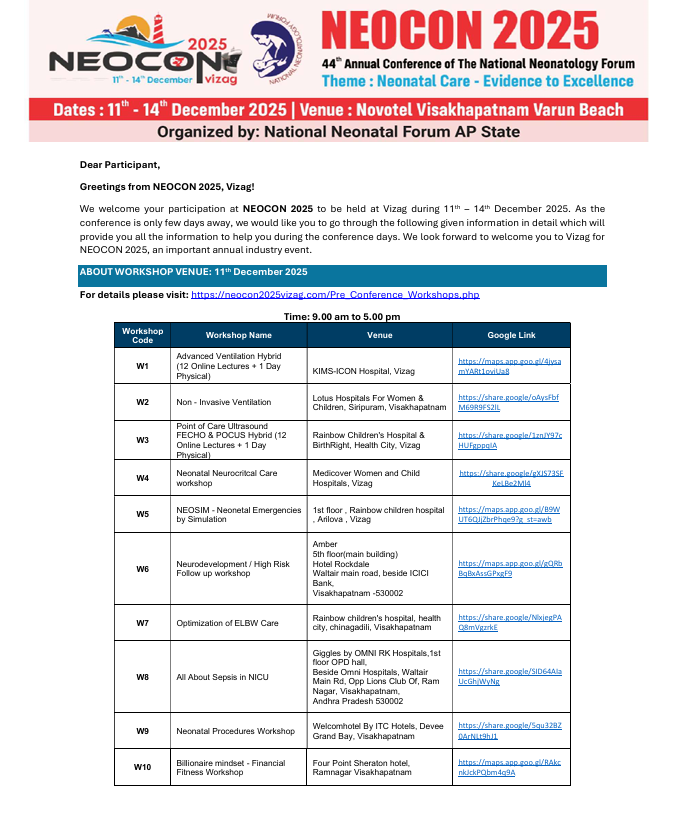 It gives us immense pleasure to extend a warm and heartfelt invitation to NEOCON 2025 Vizag – the 44th Annual Conference of the National Neonatology Forum. The event will be held in the picturesque coastal city of Visakhapatnam, Andhra Pradesh, from 11th to 14th December 2025.