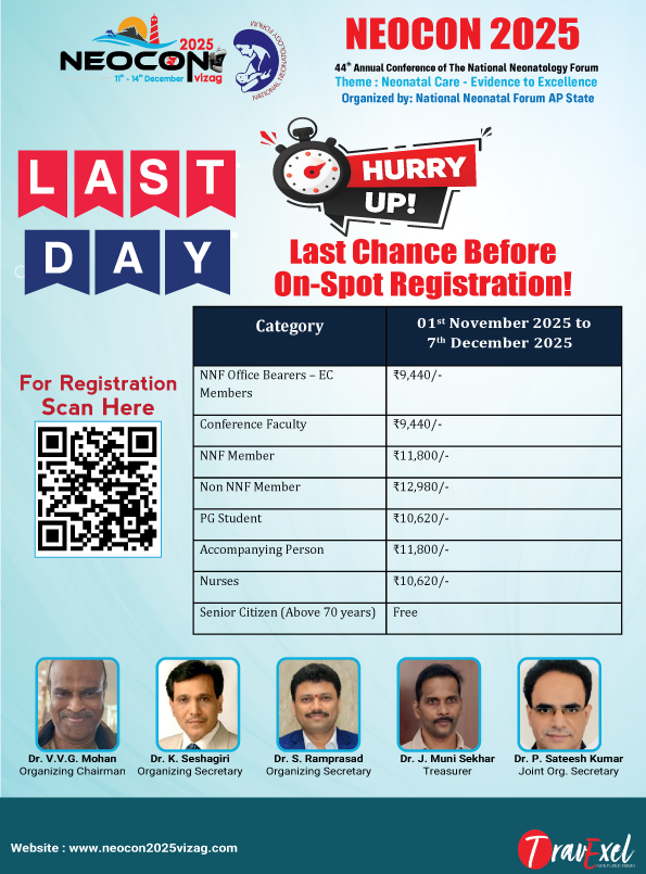 It gives us immense pleasure to extend a warm and heartfelt invitation to NEOCON 2025 Vizag – the 44th Annual Conference of the National Neonatology Forum. The event will be held in the picturesque coastal city of Visakhapatnam, Andhra Pradesh, from 11th to 14th December 2025.